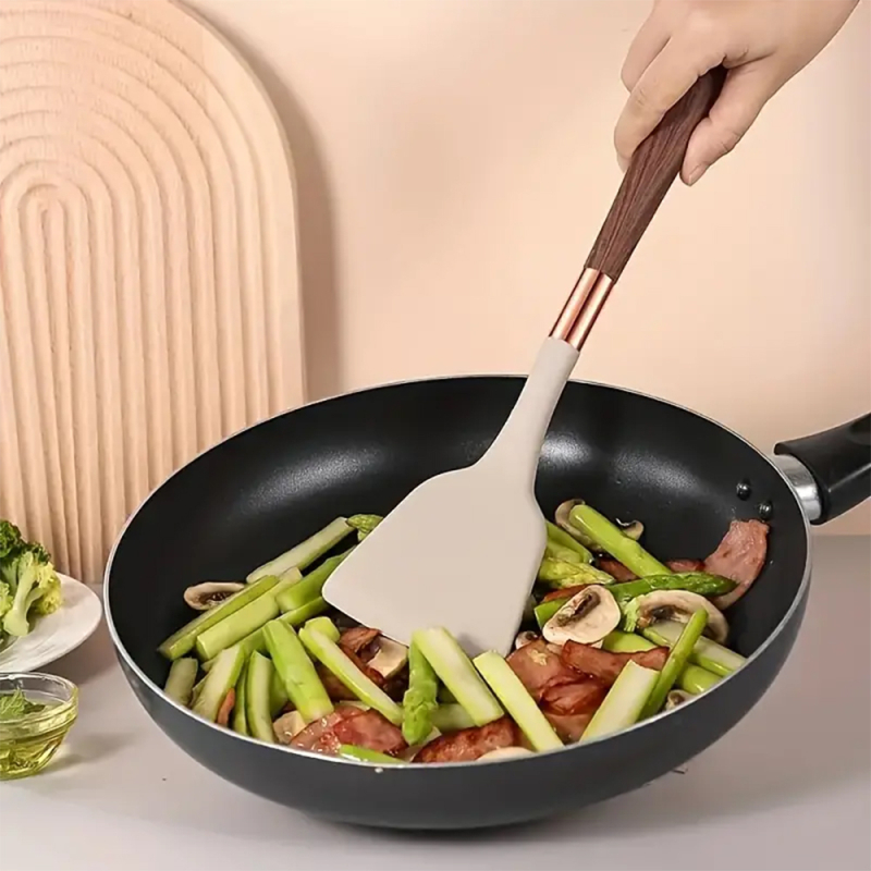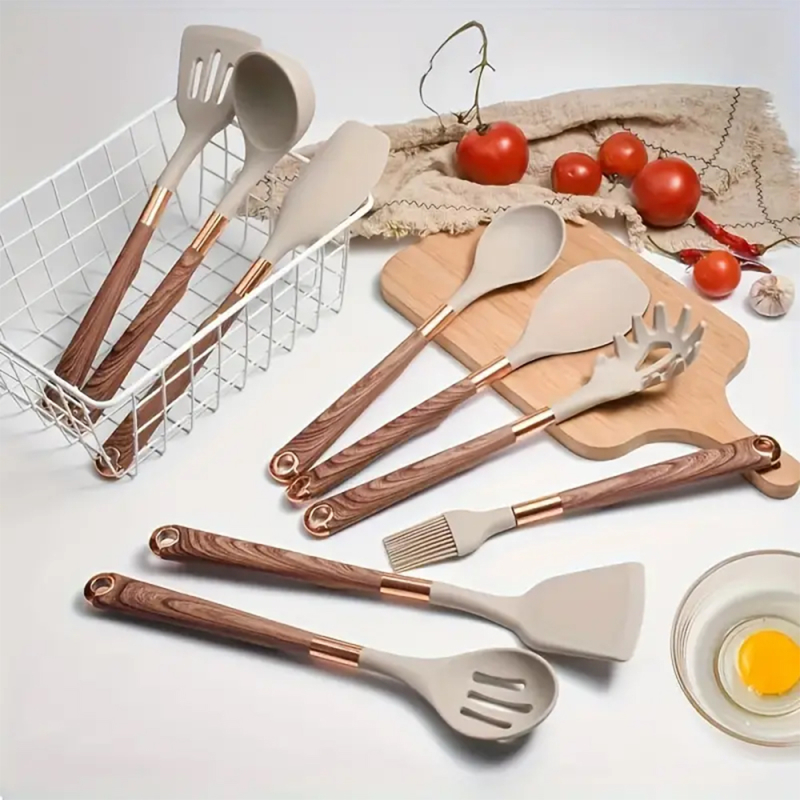 Set 12 ustensile de bucatarie din silicon pentru gatit, suport inclus, maro